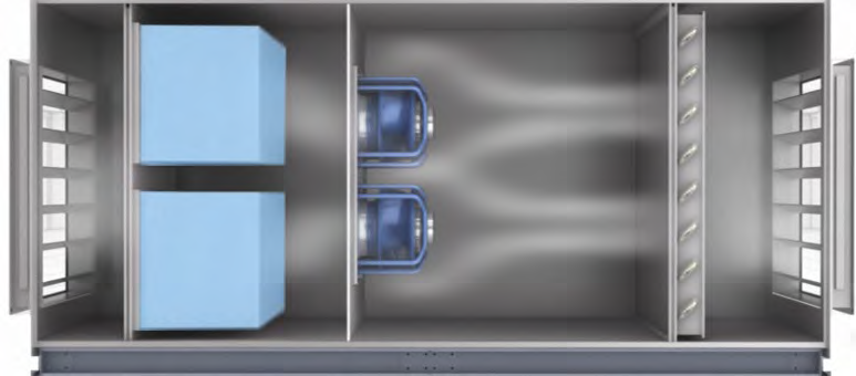 Se usan ventiladores centrífugos o radiales para poder vencer la presión estática que generan los filtros y las pérdidas por distancias y cambios de dirección de flujo de aire.